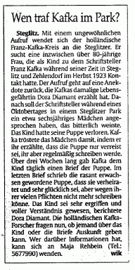 susch, ‘Franz Kafka, das Mädchen und die verlorene Puppe. Amerikanischer Professor bittet die Steglitzer und Zehlendorfer um ihre Mitarbeit’, Berliner Abendblatt Zehlendorf, 11-10-2000.