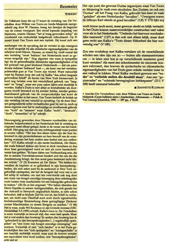 Een belangrijke kwestie, vond ook de redactie van het Kafka-Katern, toen het blad van de Kafka-Kring. Germaniste én bestuurslid Jeannette Klusman boog zich uitgebreid over de kwestie, waarvan hieronder de tekst. Bovendien kwam het eind april uitvoerig ter sprake in het VPRO-programma De Avonden, waarvan het Katern een transcriptie maakte en publiceerde. De kern van de felle discussie draaide om smaakverschil en richtte zich tegen Hansens opmerking dat een vertaling moet ‘bekken’ en de vertaling eigenlijk over moest.